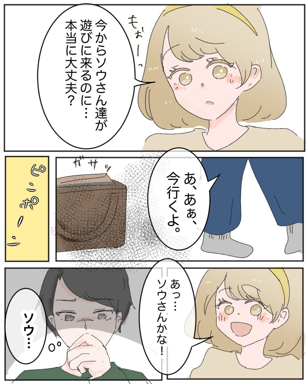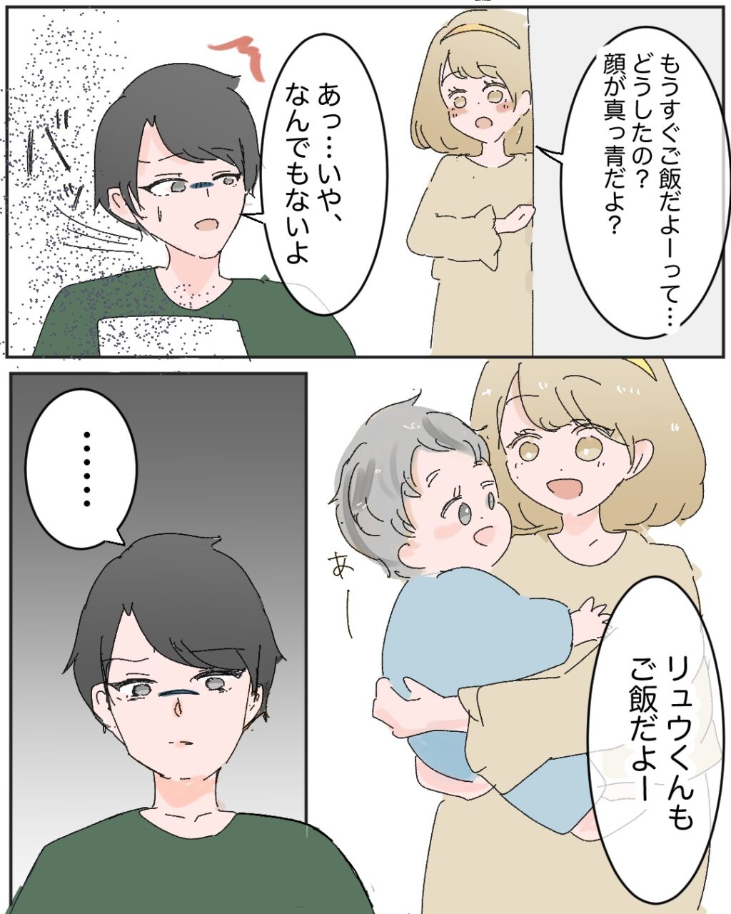 リュウを見つめたまま固まった俺に、チナツは「今からソウさん達が遊びに来るのに・・・本当に大丈夫?」と声をかけます。俺は封筒を自分のバッグにしまい、「あ、あぁ今行くよ」と部屋を出ました。動揺した気持ちを落ち着ける間もなくインターホンが鳴り、弟家族がやってきました。