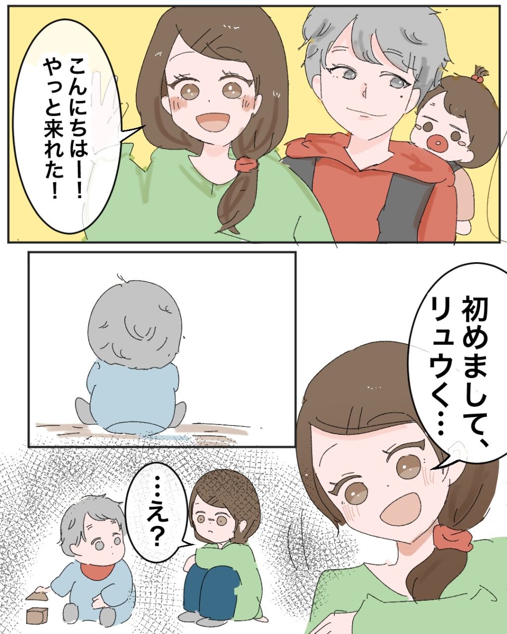 第二子を出産した妻ツバキさんを連れて、弟のソウが実家にやってきました。産まれたばかりの赤ちゃんも一緒です。「こんにちは!やっと来れた」と元気に挨拶するツバキさん。真っ先にリュウの姿を見つけると、初めましての挨拶をしにきてくれました。しかし、ツバキさんはリュウの顔を見るなり、「・・・え?」と言って固まっていました。
