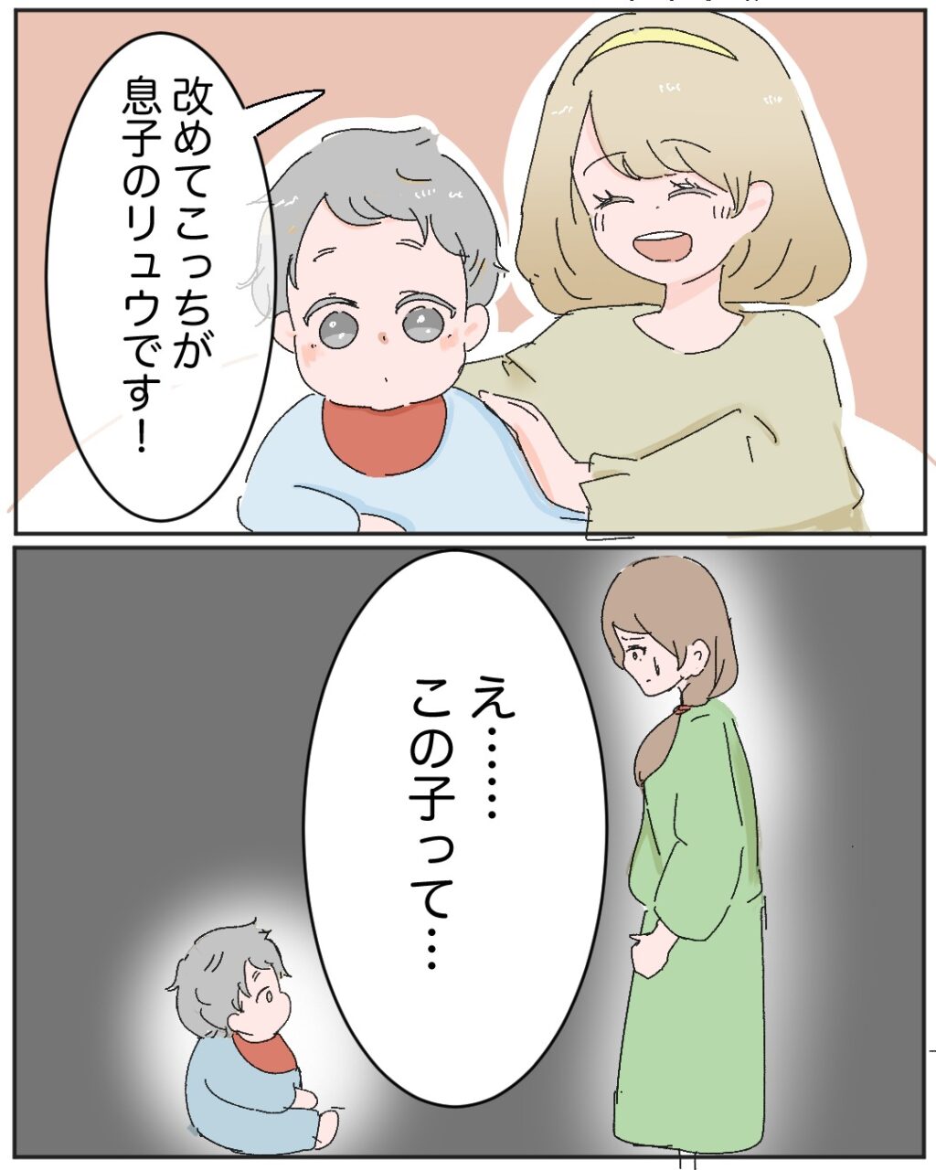 「改めてこっちが息子のリュウです!」チナツがリュウを紹介すると「え・・・この子って・・・」と言い、その場に立ち尽くしてしまいました。子どもが兄弟に似るのはよくあることだけど、あまりにもソウに似すぎている・・・ツバキさん本人が口にしたわけではありませんが、表情や様子から、そう言っているように感じました。