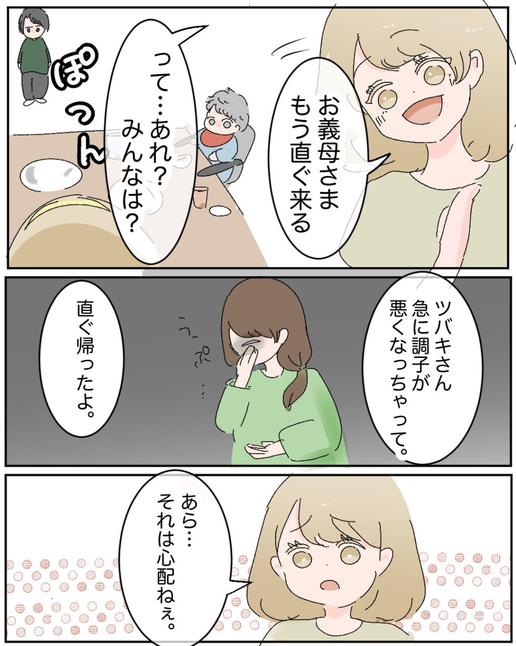 「なんか体調悪くなってきちゃった・・・来たばっかりだけどお暇しようかな」と真っ青な顔で言うツバキさん。ふらつく体を支えようと、ソウが背中に手を添えようとしますが、パシッと払われてしまいました。ツバキさんのただならぬ様子に何かを察したのか、ソウは「悪い、帰るわ・・・」と言い、ツバキさんと子どもたちを連れて帰っていきました。