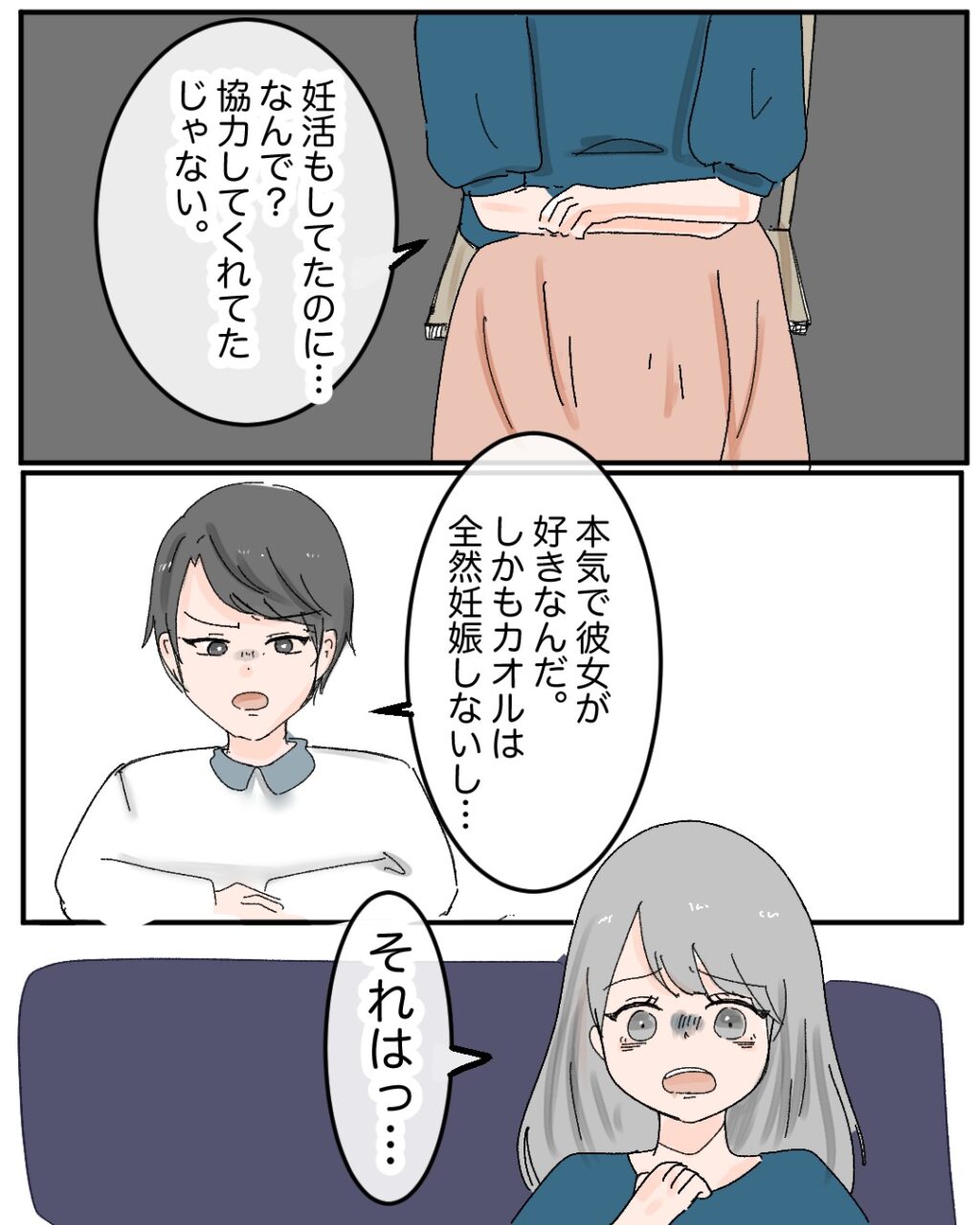 ある日突然、別の女性に子どもができたからと夫つかさに離婚を切り出されてショックを受けた私。私たちはお互いに妊活に協力して一緒に頑張っていたのにどうして?つかさを問い詰めると、「本気で彼女が好きなんだ。しかもカオルは全然妊娠しないし」とハッキリ言い放ちました。「それはっ」言いかけて、私は言葉を飲み込みました。