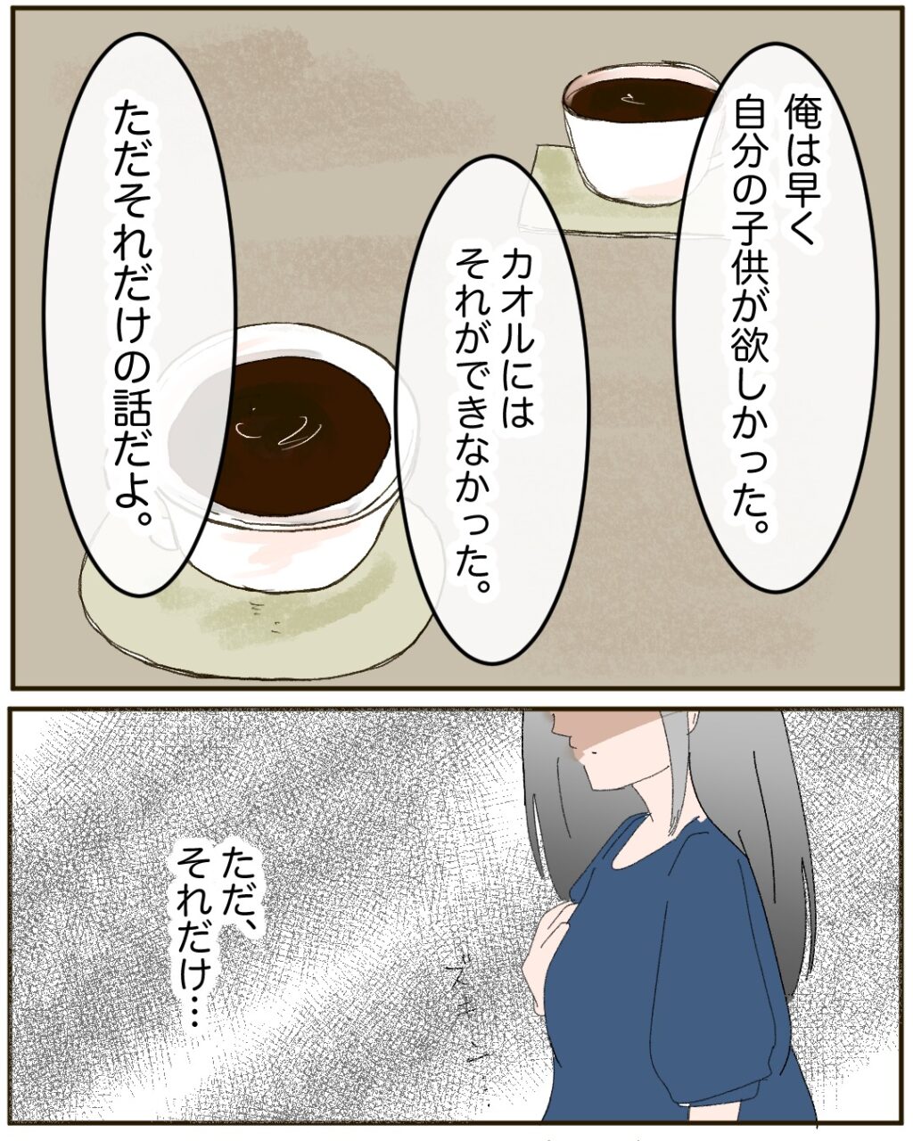 早く自分の子供が欲しかったと言うつかさは、「カオルにはそれができなかった。ただそれだけの話だよ。」と冷たく、淡々と言いました。それだけ?私たちの子供ができることに希望を持って、2人で頑張って治療してきた時間をそんな簡単な言葉で片付けられて、本当にショックでした。