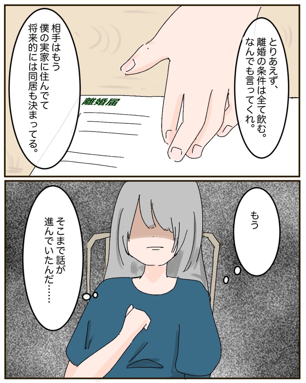 つかさは、何かの説明文を読み上げるかのように、「とりあえず、離婚の条件は全てのむ。なんでも言ってくれ。相手はもう僕の実家に住んでて将来的には同居も決まってる。」とスラスラと無感情に話しました。それを聞いてもうそこまで話が進んでいたことに驚き愕然としました。
