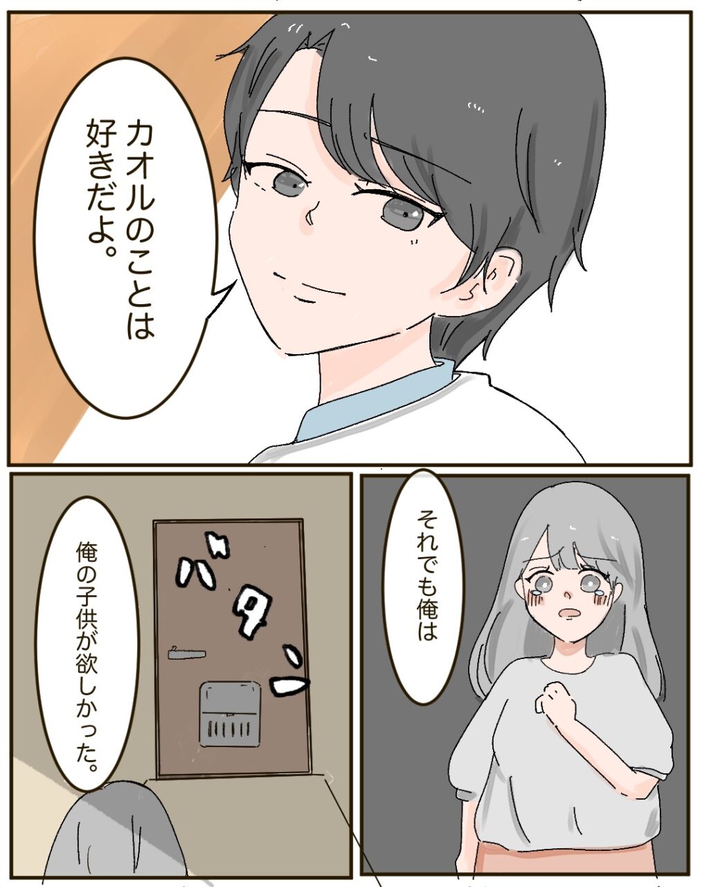 「カオルのことは好きだよ。」微笑んで振り返ったつかさは、「それでも僕は、俺の子供が欲しかった。」まるで終わったことのように、私の気持ちなんて無視するかのように、つかさはサラリと言って家を出て行きました。