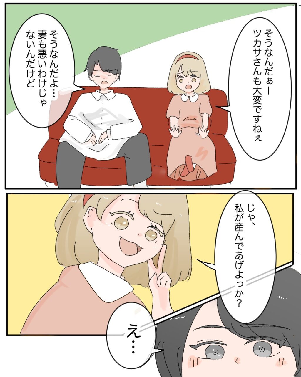 チナツは俺の話をいつも親身になって聞いてくれました。跡継ぎのことで悩んでいることを話すと、「そうなんだぁー。ツカサさんも大変ですねぇ」と寄り添ってくれ、「そうなんだよ・・妻も悪いわけじゃないんだけど」と言うと「じゃ、私が産んであげよっか?」とチナツがさらりと言うので「え・・」と驚きました。