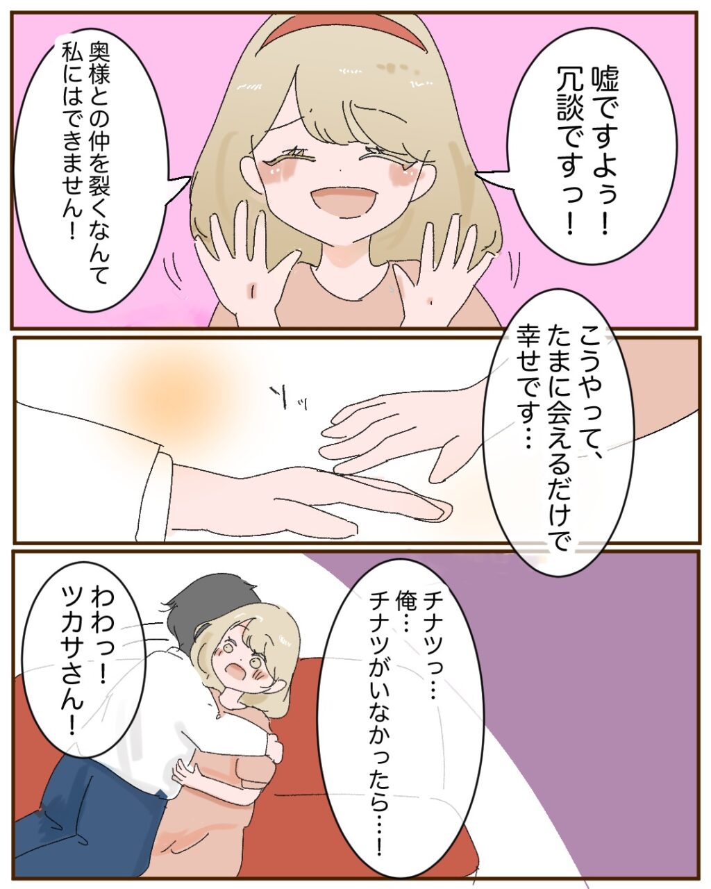 すぐにチナツは「嘘ですよぅ!冗談ですっ!」と笑い「奥様との仲を裂くなんて私にはできません!こうやって、たまに会えるだけで幸せです・・」と言ってそっと手を握ってくれました。健気なチナツが可愛くて可愛くて・・俺はどんどんチナツに惹かれていきました。
