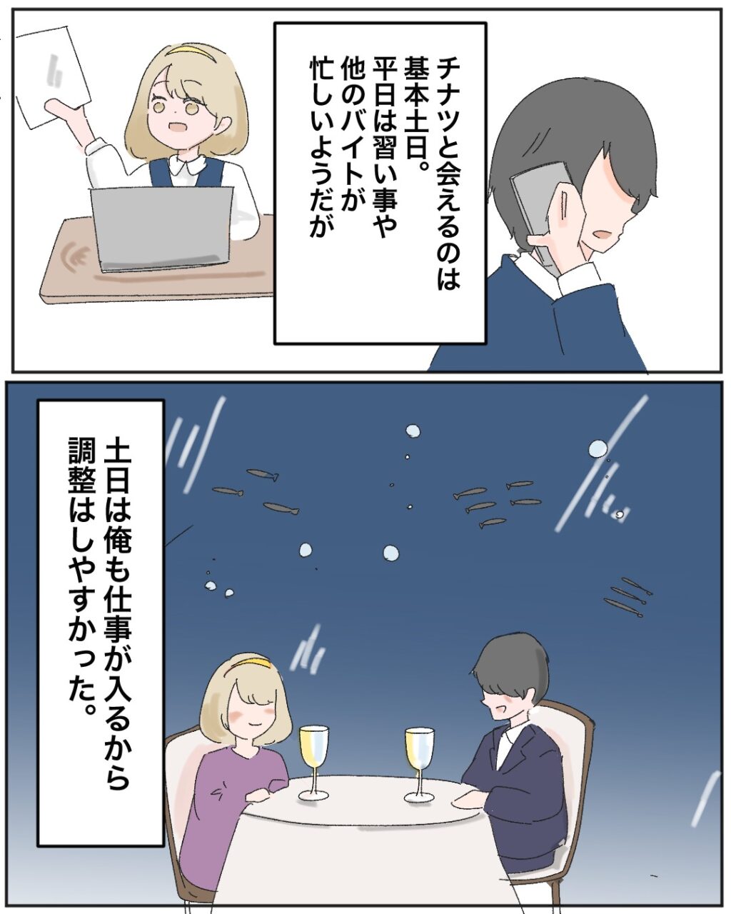 チナツと会えるのは基本土日でした。平日は派遣の仕事の他にもアルバイトや習い事をしているそうで忙しくてなかなか会えないけれど、土日に仕事が入ることもある俺は調整がしやすかった。