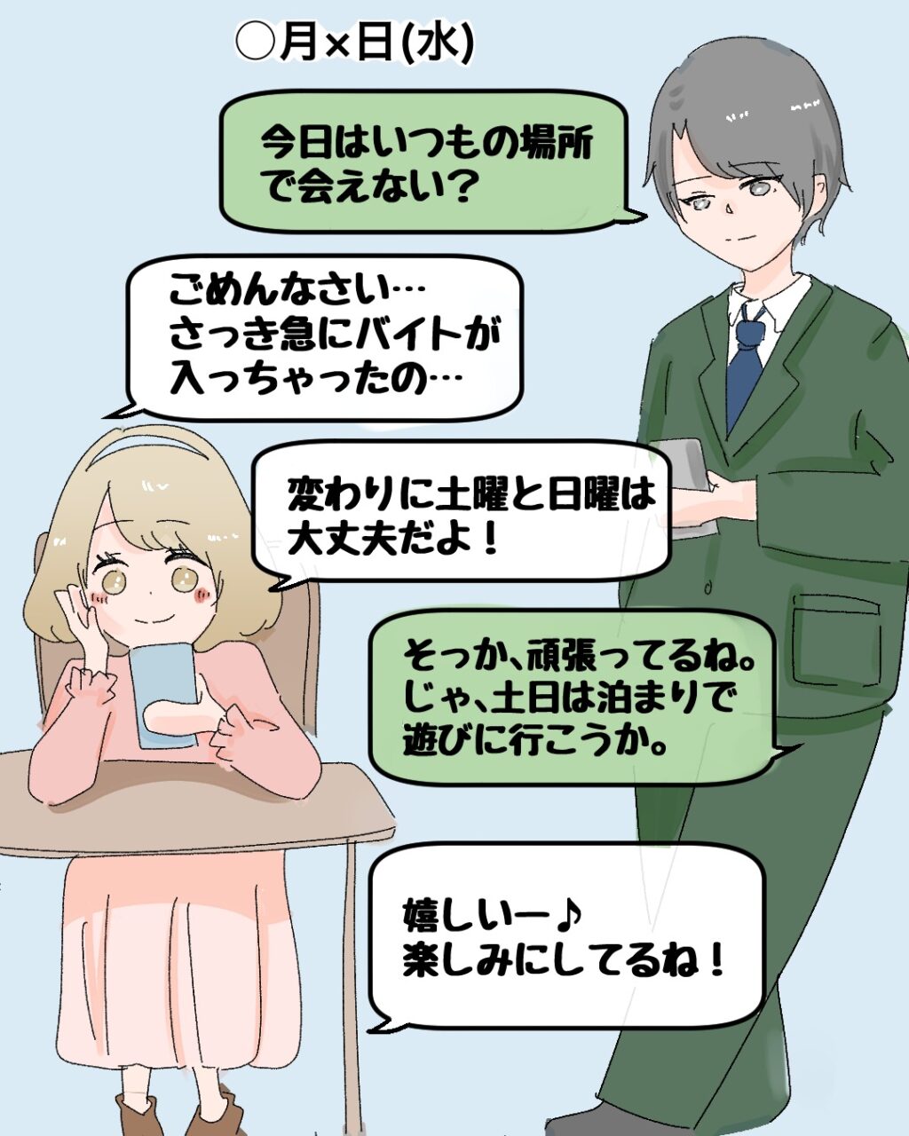 「今日はいつもの場所で会えない?」「ごめんなさい・・さっき急にバイトが入っちゃったの・・」「変わりに土曜と日曜は大丈夫だよ!」「そっか、頑張ってるね。じゃ、土日は泊まりで遊びに行こうか」「嬉しいー!楽しみにしてるね!」平日はなかなか会えないけれど、メッセージのやり取りをするだけで楽しかった。