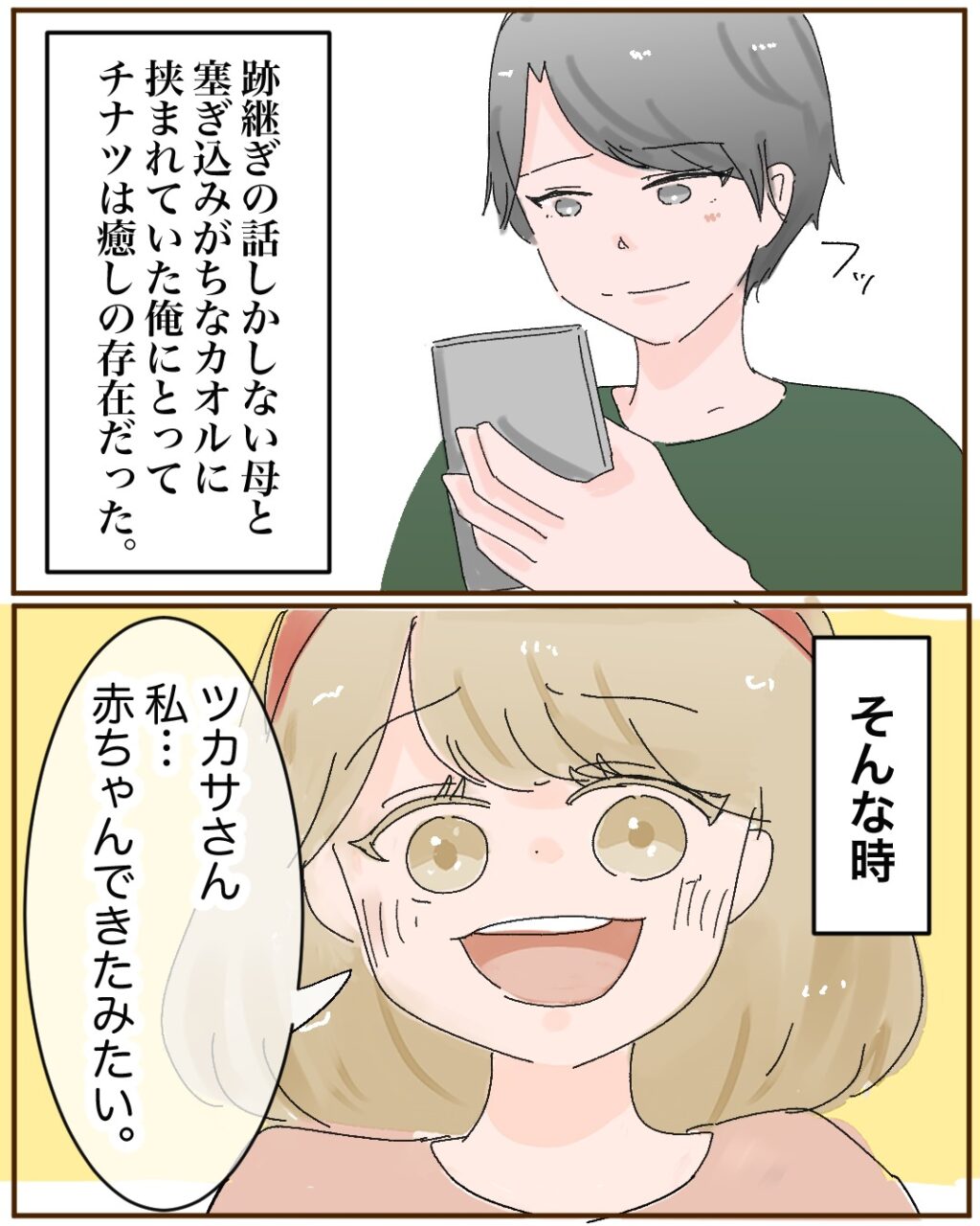 子どもができないことで母親とカオルさんとの板挟みになって疲れていたつかささんは、親身に話を聞いてくれて健気なチナツさんにどんどん惹かれていきました。仕事以外にもアルバイトや習い事をしているチナツさんには平日なかなか会えず、会うのは基本は土日でした。会えない平日も、メッセージのやり取りだけで幸せな気持ちになるつかささん。つかささんにとってチナツさんは癒しの存在になっていました。そんな時、チナツさんから「赤ちゃんができた」と報告を受けました。