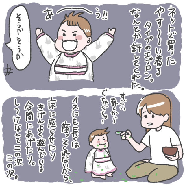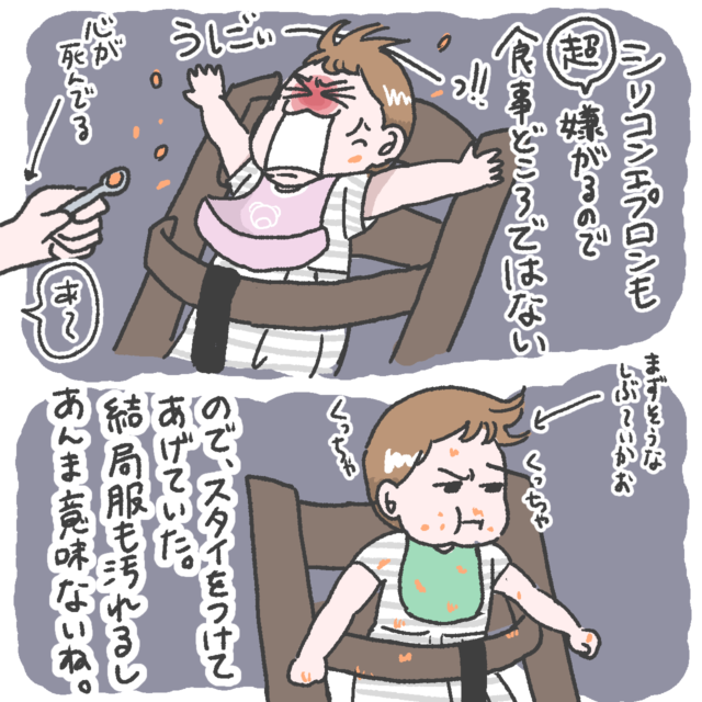 シリコンエプロンも超嫌がって食事どころではなくなるので、スタイを付けて食べさせていましたが・・・