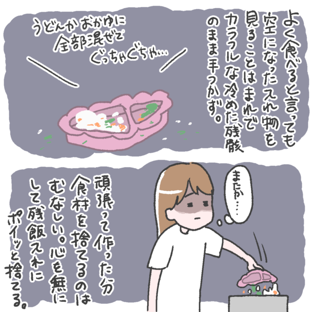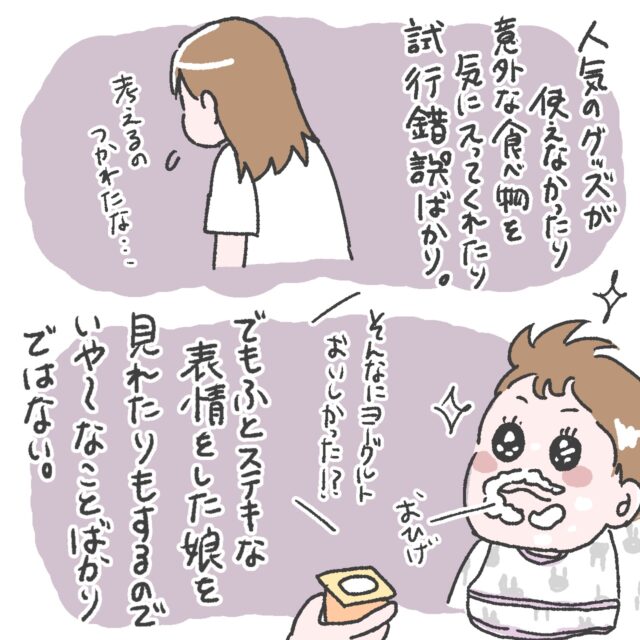 頑張って作った離乳食をほとんど食べてくれず、それを自分で捨てないといけない・・・報われなさに虚しさを感じてしまいますよね。食事の時間を幸せで楽しいものだと思って欲しいというしおさんの気持ち、娘ちゃんにもきっと伝わると思います!