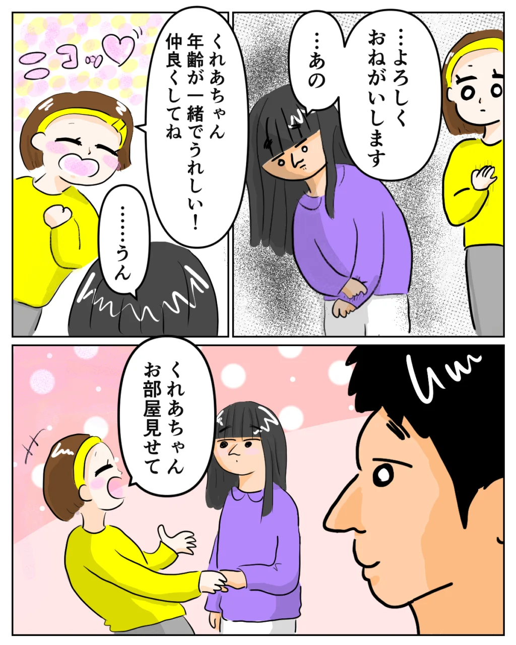 それでもくれあちゃんは小さな声で「よろしくお願いします」と言ってくれました。愛花は同じ年の家族ができてうれしそうです。さっそくお部屋をみせてとくれあちゃんに積極的に話していました。どうやら性格は真逆のように見えるくれあちゃんと愛花ですが、これから仲良くやっていけるといいな。