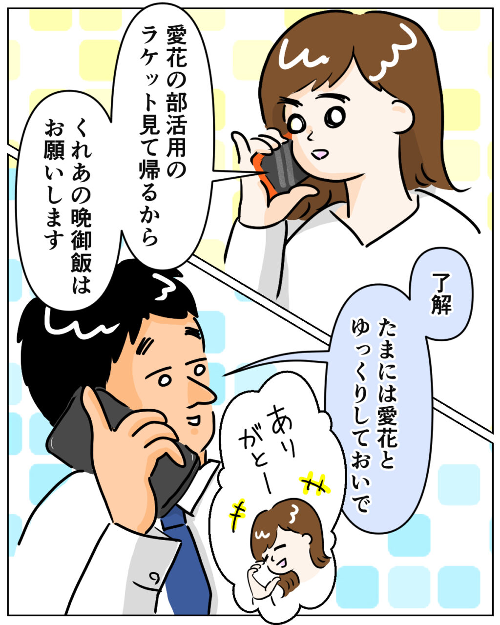 「愛花の部活用のラケット見て帰るから、くれあの晩御飯はお願いします」達夫さんに電話でそう言うと、「了解。たまには愛花とゆっくりしておいで」と快く送り出してくれ、「ありがとー」と感謝の気持ちを伝えました。
