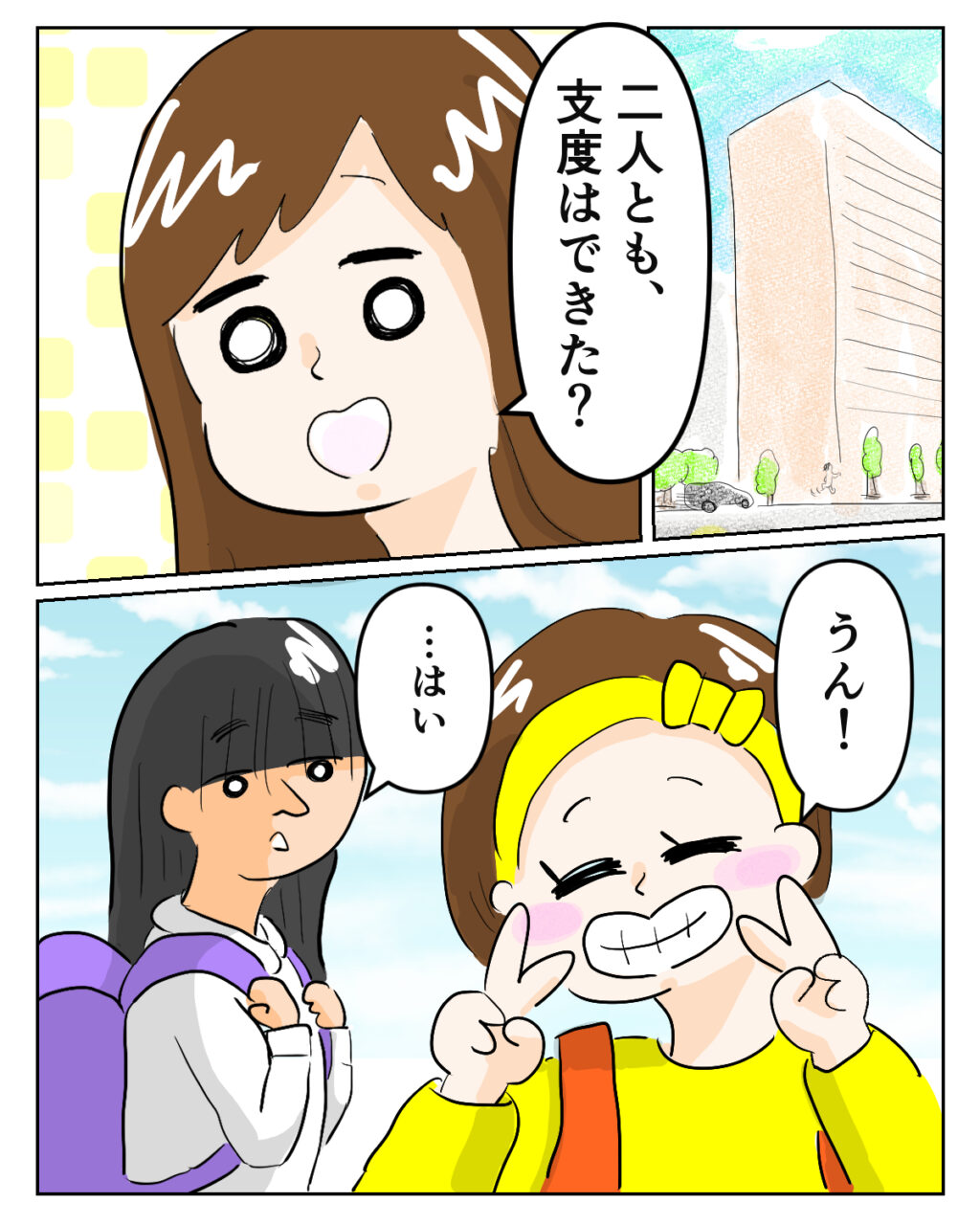 今日は、引っ越してから初めての登校日。私は愛花とくれあちゃんに「2人とも、支度はできた?」と声をかけます。「うん!」と笑顔で答える愛花に対し、くれあちゃんは「・・・はい」と、どこか距離を感じる返事。まだ家族になったばかりだし、これからよね。