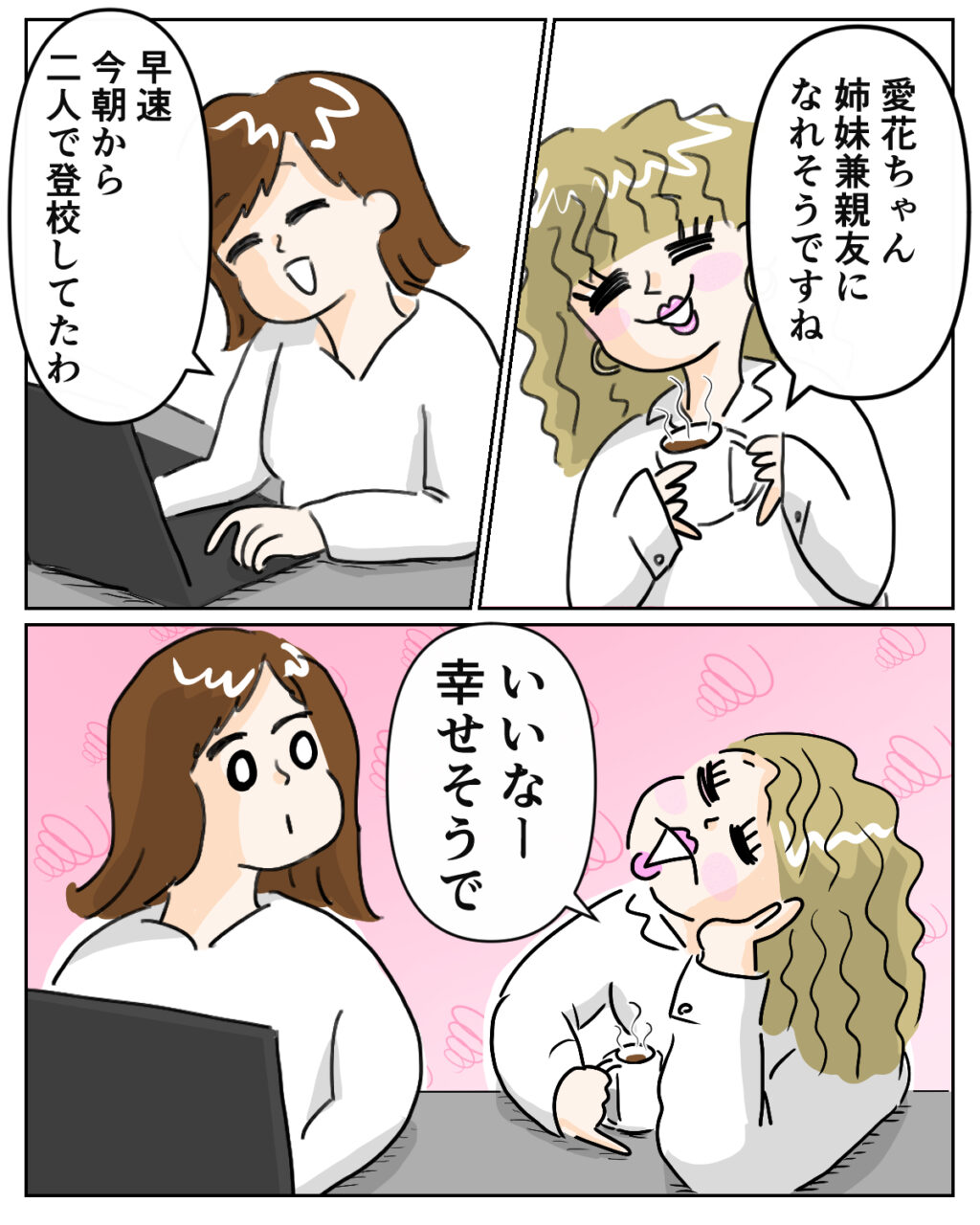 「愛花ちゃん、姉妹兼親友になれそうですね」りえは、優しい笑顔でそう言いました。性格は正反対でも、同い年の2人。私自身も、彼女たちがいつか親友同士になってくれたらいいなと思っています。すると私の表情を見たりえは、頬杖をついて「いいなー、幸せそうで」と羨ましそうにつぶやきました。
