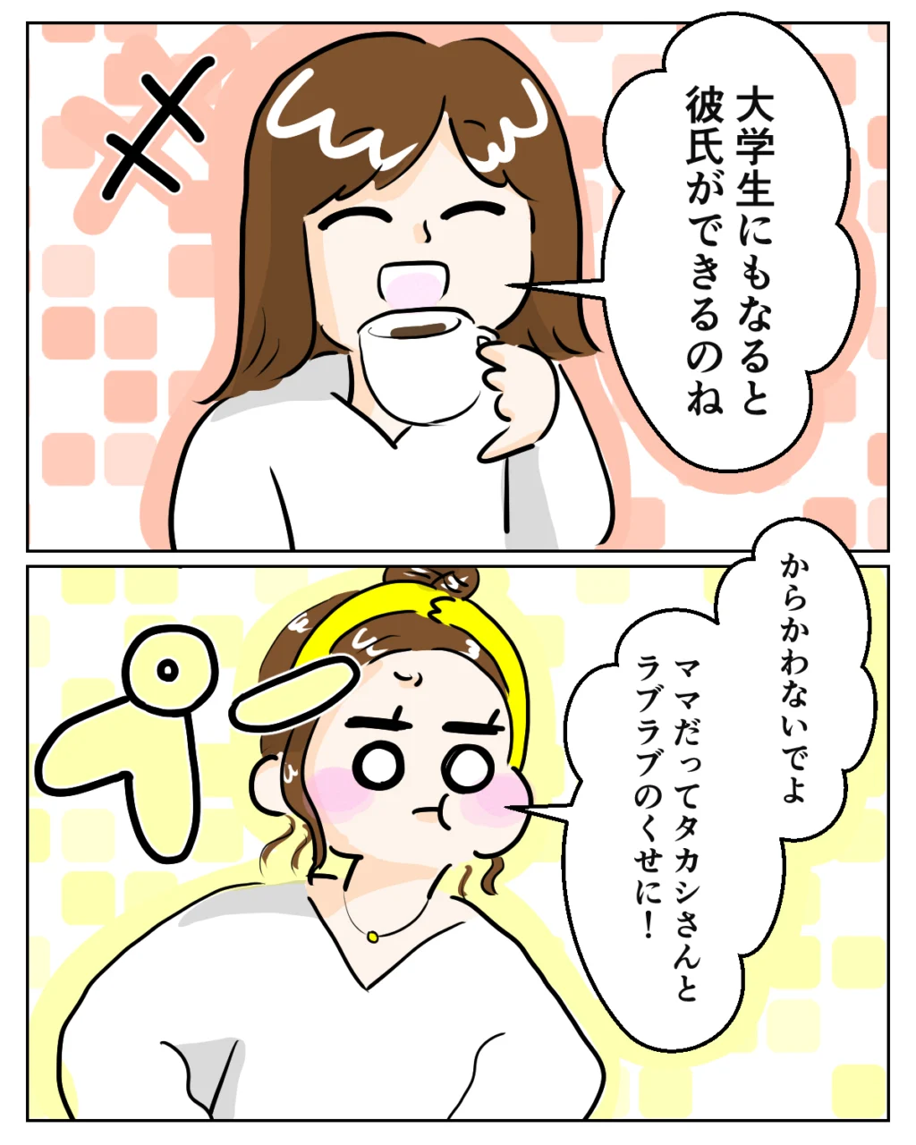 大学生になると彼氏ができるのね。愛花は大学生になり、学生生活もおしゃれも楽しむ子になっていました。感慨深い気持ちでいると、「からかわないでよ。ママだって、タカシさんとラブラブのくせに!」と愛花に言われてしまいました。