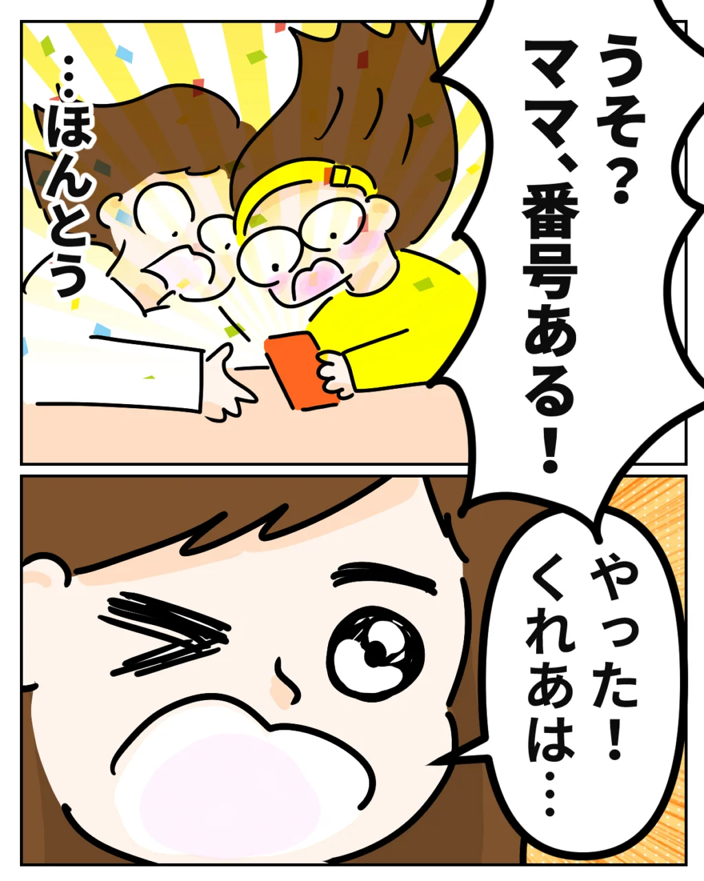 「うそ?ママ、番号ある!」愛花の言葉に、私は驚いて何度もスマホを確認しました。・・・本当だ!画面には、確かに愛花の受験番号が表示されています。私は勢いよく顔を上げ、達夫さんとくれあに「やった!くれあは・・・」と声をかけました。