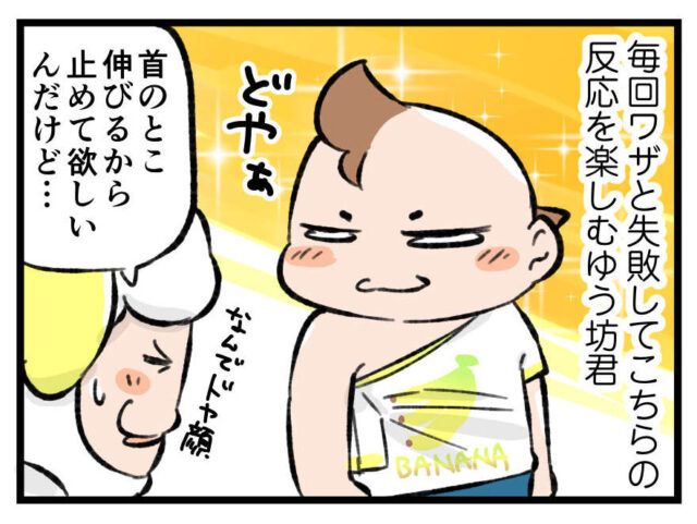 あはは!ゆう坊くんの自信満々なドヤ顔!できるのに「あえて」やらない感・・・嫌いじゃないです(笑)でも本当・・首元伸びちゃうのでほどほどでお願いしたいですねー!