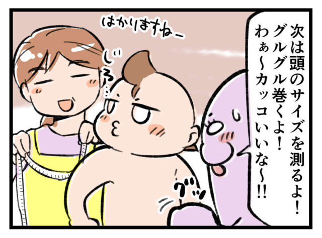 体重計は喜んで乗ったものの、身長と頭囲など興味が無い測定は大変でした。