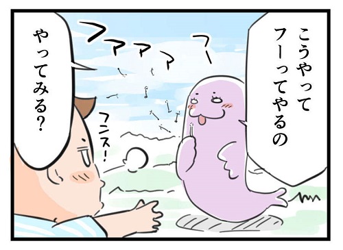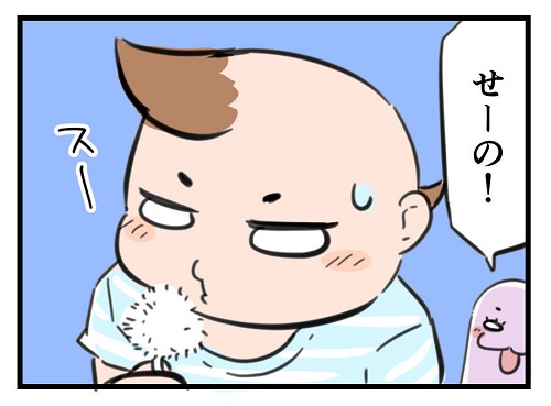 笑っちゃいけないけど面白い。フーフーに挑戦する1歳児の下唇が主張しすぎな件|左近寺しゅうりの育児漫画 2021年02月09日 ゆう坊とママがお散歩に行った時のお話。 初めてのたんぽぽの綿毛飛ばしにチャレンジしてみました。 難しいかな?と思いきや一発成功! ただし息の吹き方が分からなかったのか、下唇をやたら突き出すゆう坊君。 笑っちゃいけないけど面白い。 しっかりフーフーできるのはもう少し後。 この記事をSHAREする この記事のカテゴリー マンガ子育て幼児