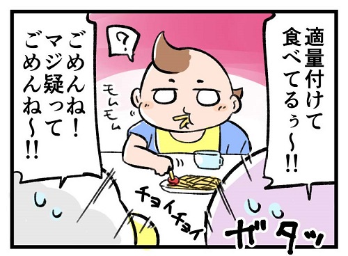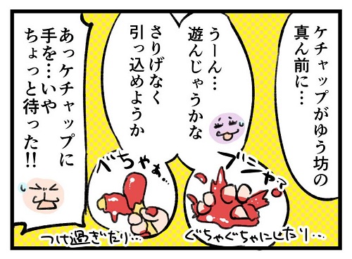 疑ってゴメン~!ケチャップの適量を完全に把握していた2歳児|左近寺しゅうりの育児漫画 2021年05月11日 先日のファミレスでフライドポテトを頼んだ時の一コマ。 はい。疑ってスミマセン。 ケチャップで遊ぶかと思いきや、ポテトの先にちょいと適量付けて食べてました。 家だと調味料はコチラで付けてたのですが、しっかりと学習していたようです。 が、お腹いっぱいになってくるとやっぱり遊び始めるので注意が必要です(笑) この記事をSHAREする この記事のカテゴリー マンガ子育て幼児