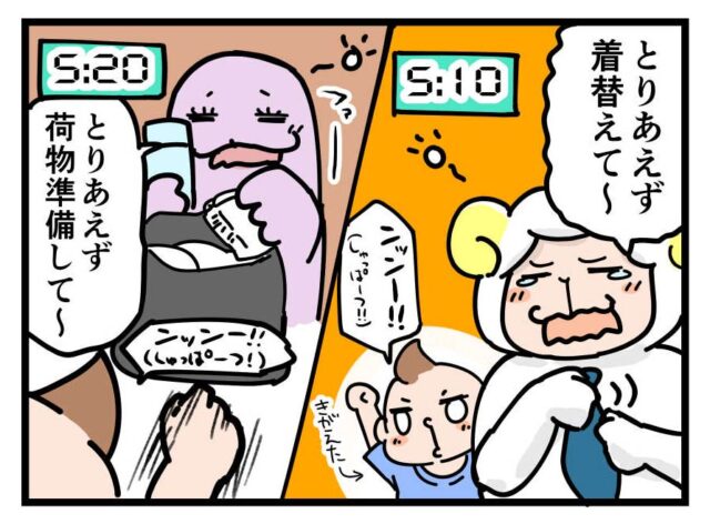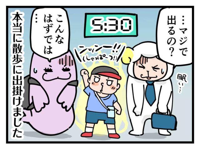 3歳の男の子ゆう坊くんのパパである左近寺しゅうり(@sakonji3)さん、今回はゆう坊くんが朝5時に起きて散歩に行こうといってきたお話です。左近寺さん夫婦はどうするのでしょうか・・・