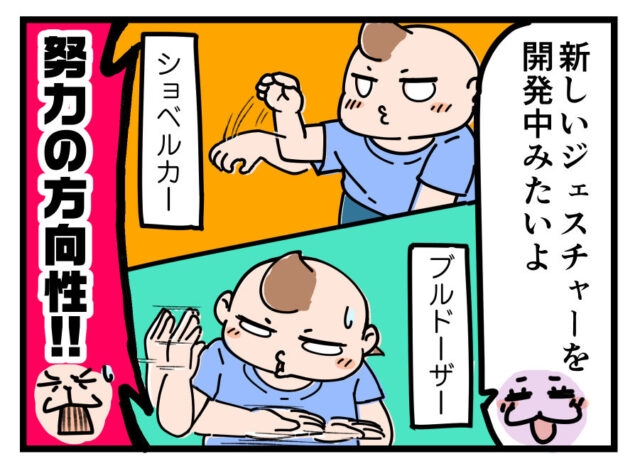ゆう坊くん、上手~!!ショベルカーとブルドーザーのジェスチャー、しっかり伝わります!一生懸命ジェスチャーを開発するゆう坊くんの真剣な顔がカッコイイです!