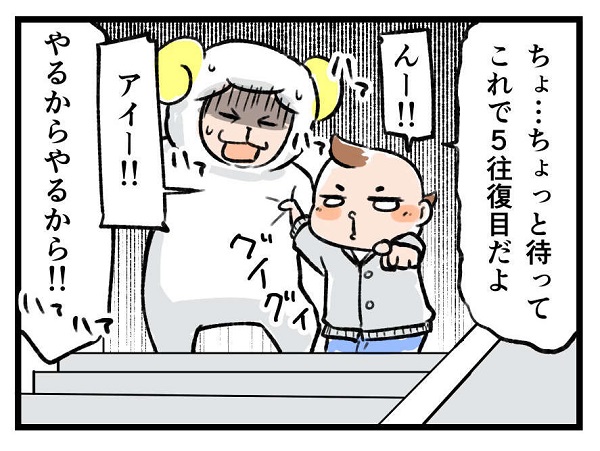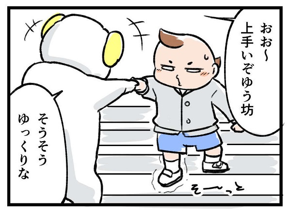1歳児のやる気とパパの体力|左近寺しゅうりの育児漫画 2020年11月03日 1歳児のやる気とパパの体力 一歳と三か月頃の話。 歩き出しがちょっと遅かったゆう坊ですが、一度歩き出したらハイペース! 毎日公園の階段を昇り降りを繰り返して、あっという間にマスターしました。 幼児の成長速度に驚くついでに自分の体力の衰えにちょっと悲しくなった瞬間です…。 この記事をSHAREする この記事のカテゴリー 子育て幼児