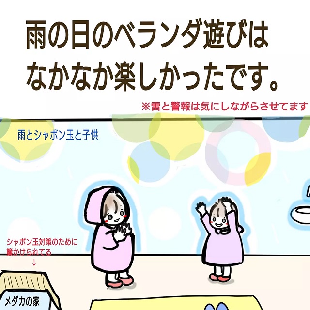そんな中、庭で飼育しているメダカを覗きに出ていると、子供たちも外に出てしまい、そのまま雨の中、庭で外遊びすることになってしまいました。