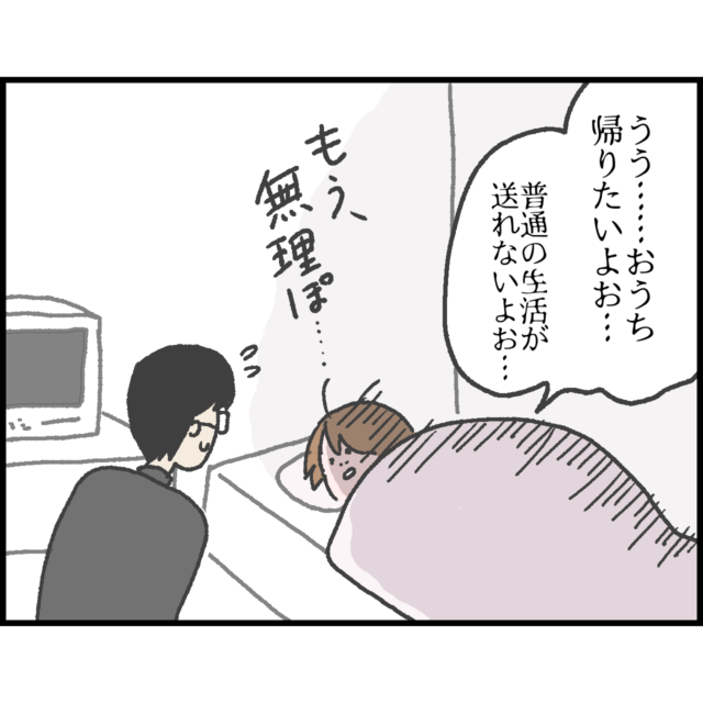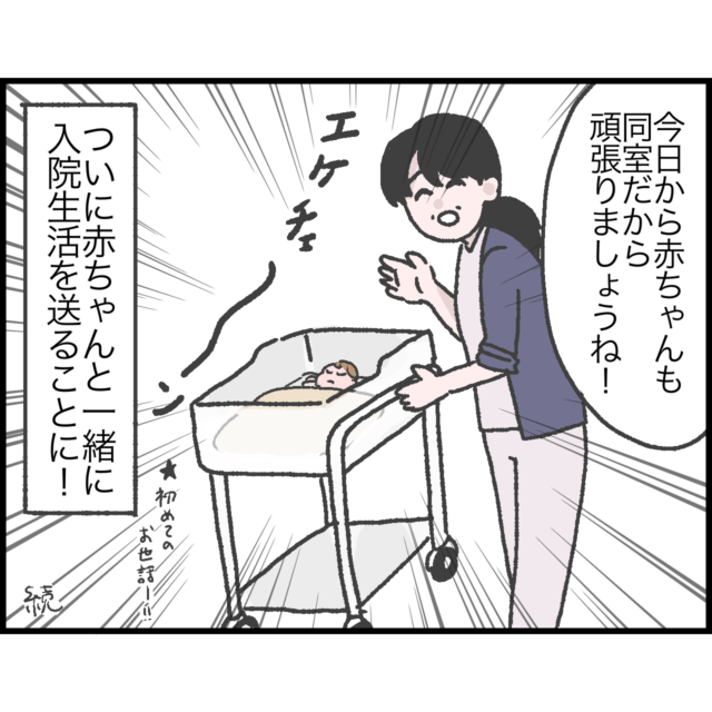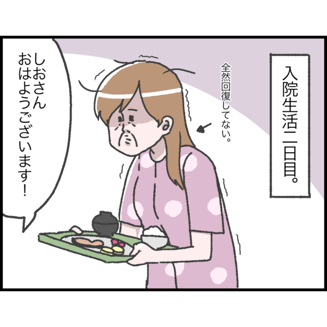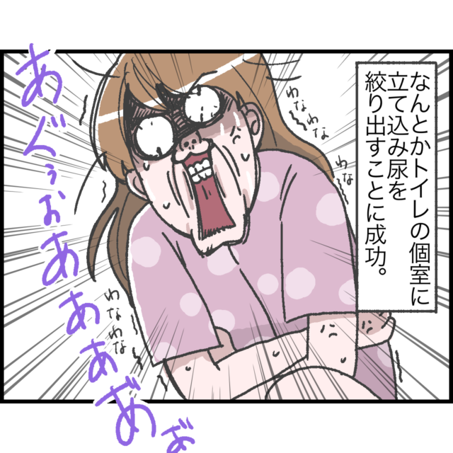 出産後、尿意を感じトイレに行ったのになぜかおしっこの出し方がわからなくなっていたしおさん。夜、面会に来てくれたご主人と話していると猛烈に尿意を感じトイレに行こうとしますが、体に力が入りません。産院の廊下をご主人に支えられよろめきながら、この尿意を逃すまいと必死にトイレを目指すしおさんでした・・・。