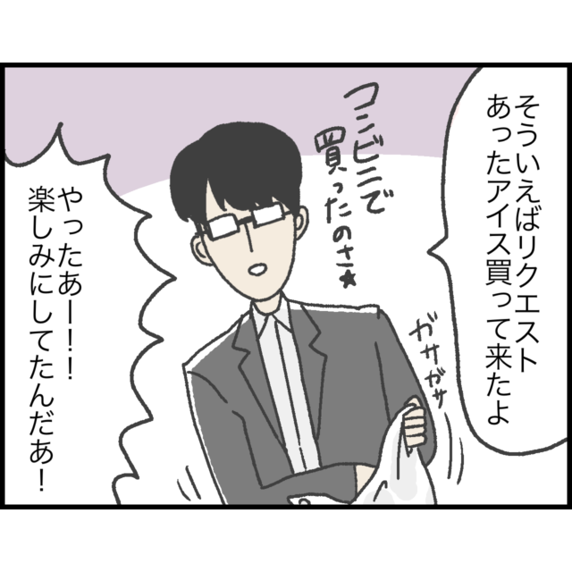 夫婦だけだった生活から3人家族の生活になったことを実感する瞬間ですね!優しいご主人がしおさんのために買ってきてくれたアイスですが・・・ちょっと・・いや、だいぶ溶けているような・・・(汗)