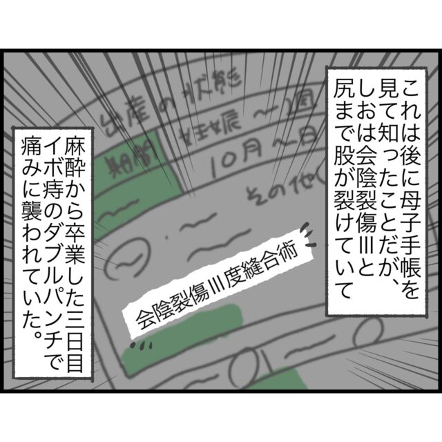 後に母子手帳を見て知ったことだが、実は「会陰裂傷3」と、尻まで股が避けていて・・
