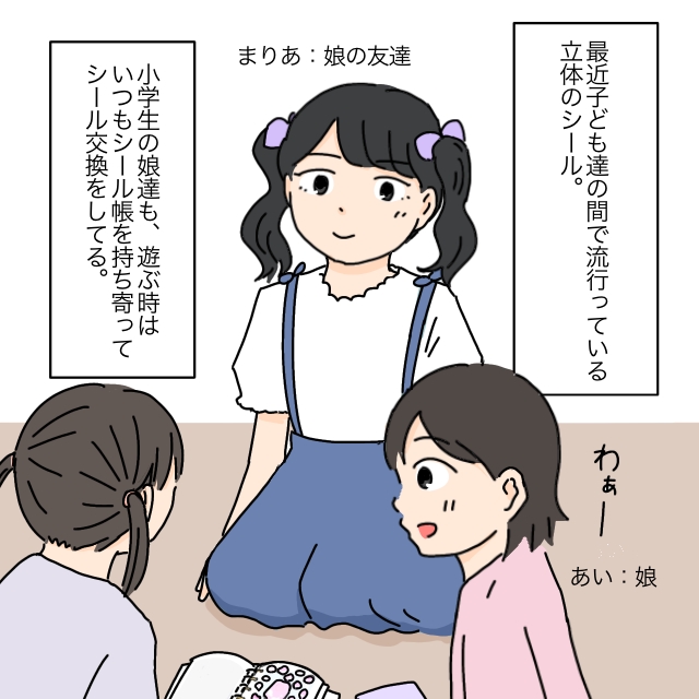 私は由依。夫と小学3年生の娘あいと暮らす主婦です。ある日の昼下がり、学校から帰ってきたあいとその友達が、今子どもたちの間で流行っているシール交換をしに家へ遊びに来ました。