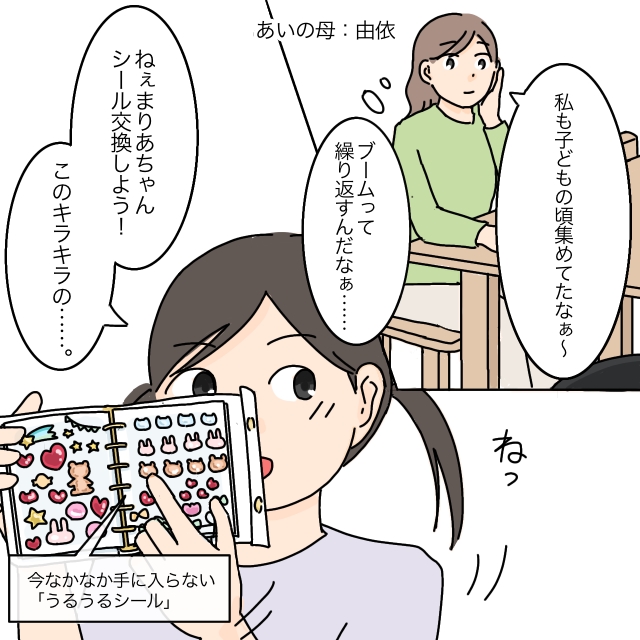 シール帳を囲んで楽しそうにしているあいたちの様子を、私は少し離れたところから眺めていました。「私も子どもの頃集めてたなぁ~」そんな懐かしい気持ちが、ふとよみがえります。するとあいの友達が、「ねぇまりあちゃん、シール交換しよう!このキラキラの・・・」そう言って、まりあちゃんのシール帳に貼ってある、今なかなか手に入らないうるうるシールを指さしました。
