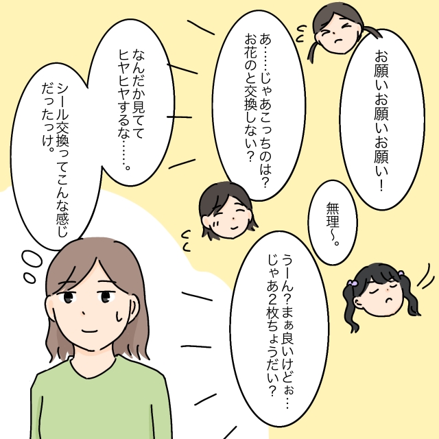 それでも友達はうるうるシールが欲しいようで、必死に食い下がります。けれど、まりあちゃんの返答は変わらず「無理」の一点張り。すると、あいが「じゃあこっちのは?お花のと交換しない?」と声をかけました。まりあちゃんは少し考えると、「うーん?まぁ良いけど・・・じゃあ2枚ちょうだい?」と言って渋々シールを差し出しました。やっていること自体は昔と変わらないのに、なんだか見ててヒヤヒヤする・・・。