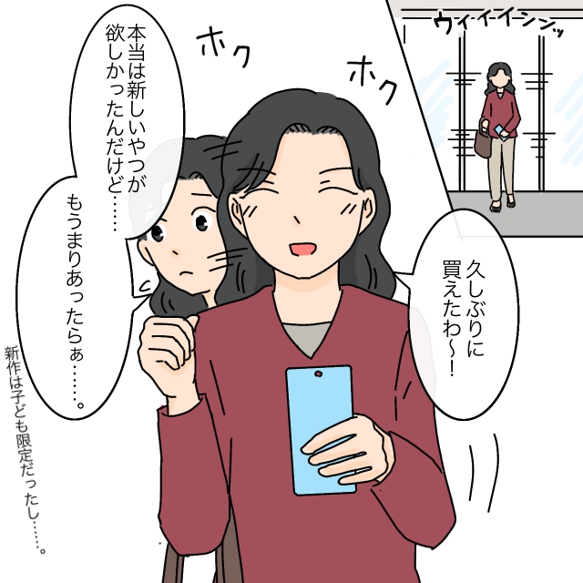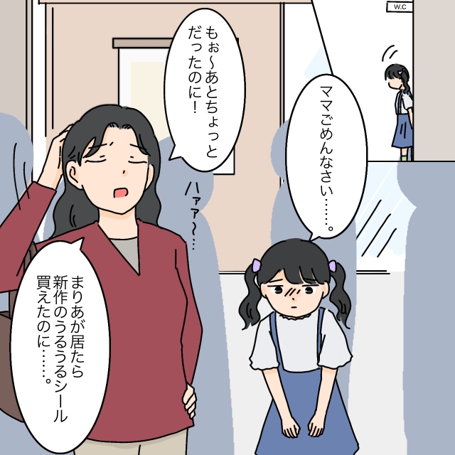 まりあちゃんのお母さん、あやかさんは巷で大人気のうるうるシールをまりあちゃんのために購入するうちに、シールの情報を集めたり購入に夢中になってしまい、本当はお母さんともっと話したり一緒に過ごしたいまりあちゃんのさみしい様子が見えなくなっていました。週末、まりあちゃんを連れてうるうるシールを買いに来たあやかさんですが、途中でまりあちゃんのお腹が痛くなってトイレに行っても、シール購入のほうが大切そうです。1枚は購入してホクホクで店から出てきたものの、まりあちゃん不在で新作が買えなかったことに不満そうです。