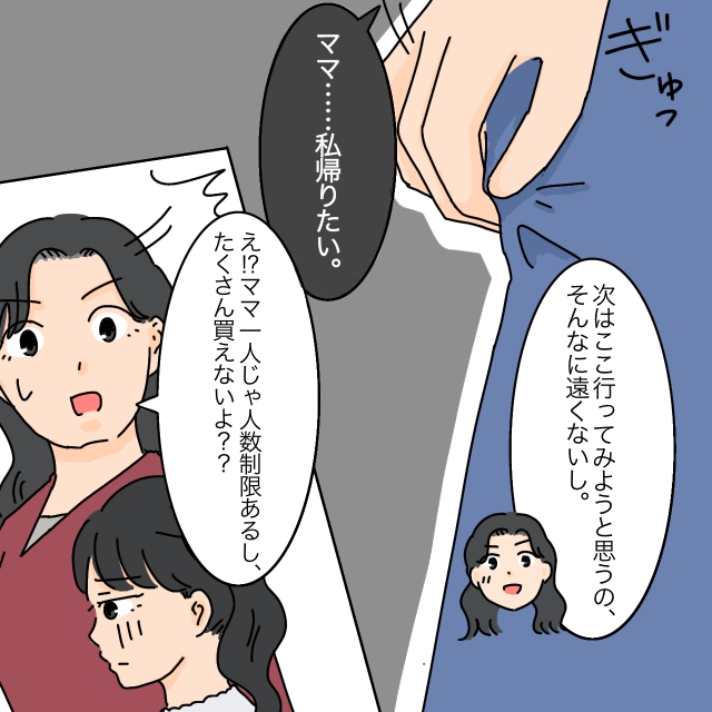 別のお店へうるうるシールを探しに行ってみようと張り切って誘うお母さんに、まりあちゃんは勇気を出して「ママ、私帰りたい。」と正直に打ち明けました。まりあちゃんはあまり顔色が良くありません。それなのにお母さんは驚いて「ママひとりじゃ人数制限あるし、たくさん買えないよ?」と頭の中はシールのことばかりです。
