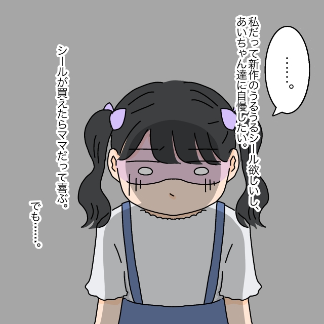 もちろんまりあちゃんだって、新作のうるうるシールは欲しいのです。そしてお友達に自慢したい。それに、シールが買えるとお母さんが喜びます。それでもまりあちゃんは、自分の気持ちをよそにシール購入に張り切るお母さんとの気持ちの温度差を感じていました。