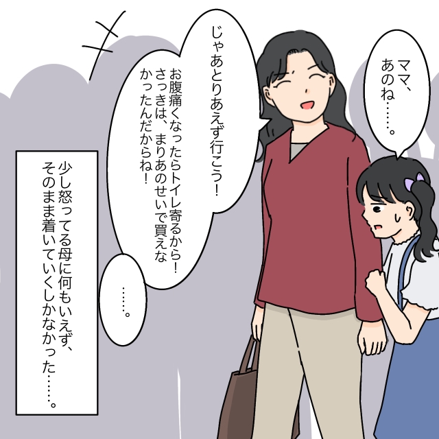 また勇気を振り絞って、「ママ、あのね・・・」と、自分は本当はどうしたいのかを伝えようと切り出しましたが、お母さんはその言葉を遮るかのように「じゃとりあえず行こう!」と語気を強めました。「お腹痛くなったらトイレ寄るから!さっきは、まりあのせいで買えなかったんだからね!」笑顔を作っているものの明らかに少し怒っているお母さんにまりあちゃんは何も言えず、結局は次のお店について行くしかありませんでした。