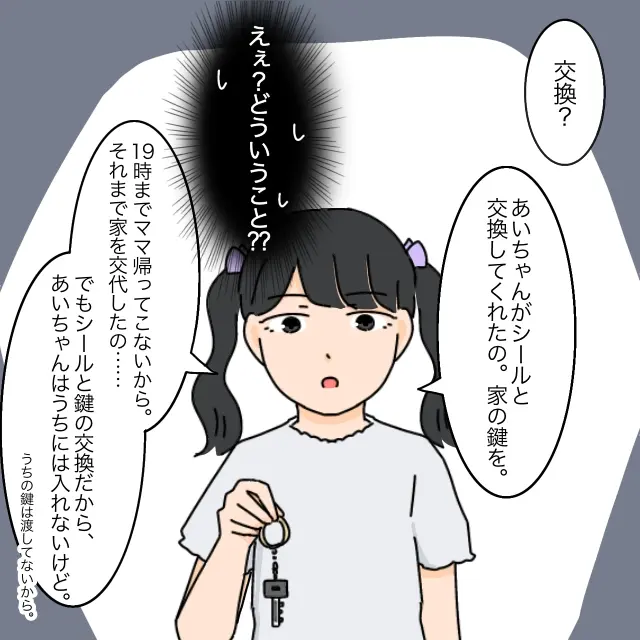 意味がわからず「交換?」と聞き返すと、まりあちゃんはポケットからあいに持たせていた我が家の鍵を取り出し「あいちゃんがシールと交換してくれたの。家の鍵を」と言いました。えぇ?どういうこと??説明を聞いても理解が追いつかない私に、まりあちゃんは「19時までママ帰って来ないから。それまで家を交代したの・・。でもシールと鍵の交換だから、あいちゃんはうちには入れないけど。うちの鍵は渡してないから」と続けました。