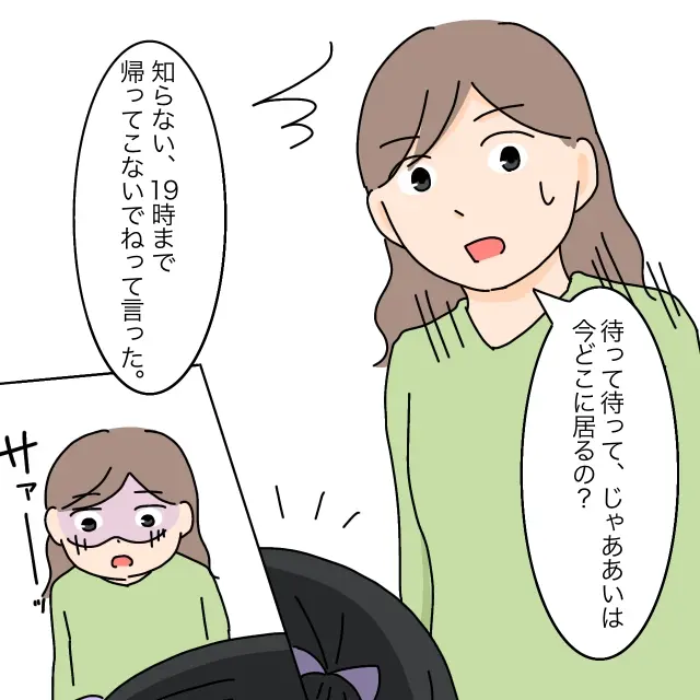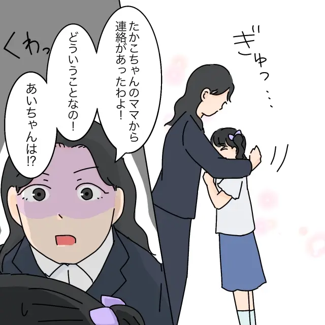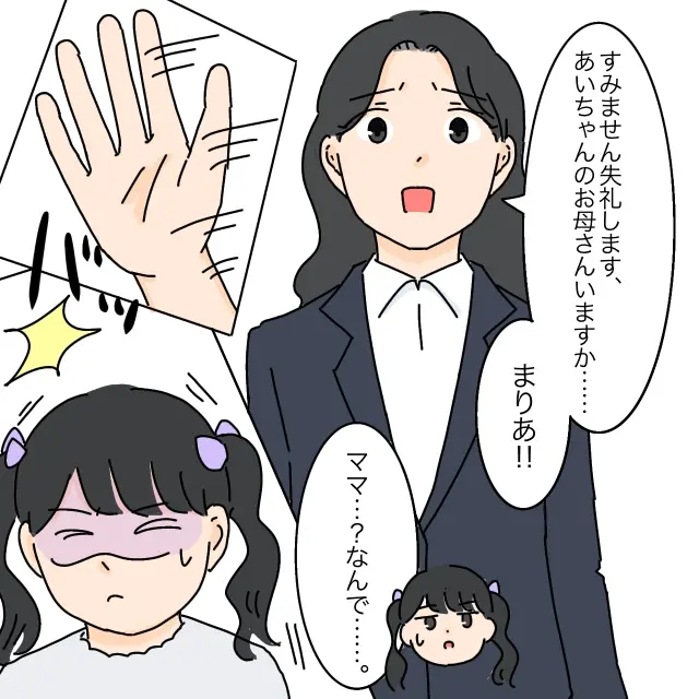驚きながら玄関を開けると、「すみません失礼します、あいちゃんのお母さんいますか・・」と血相を変えたまりあちゃんのお母さんが立っていました。「まりあ!!」とお母さんに呼ばれたまりあちゃんが「ママ・・?なんで・・」と困惑気味に玄関に出て行くと、お母さんがバッと手を上げました。怒られると思ったのか、まりあちゃんはビクッとして目を閉じます。