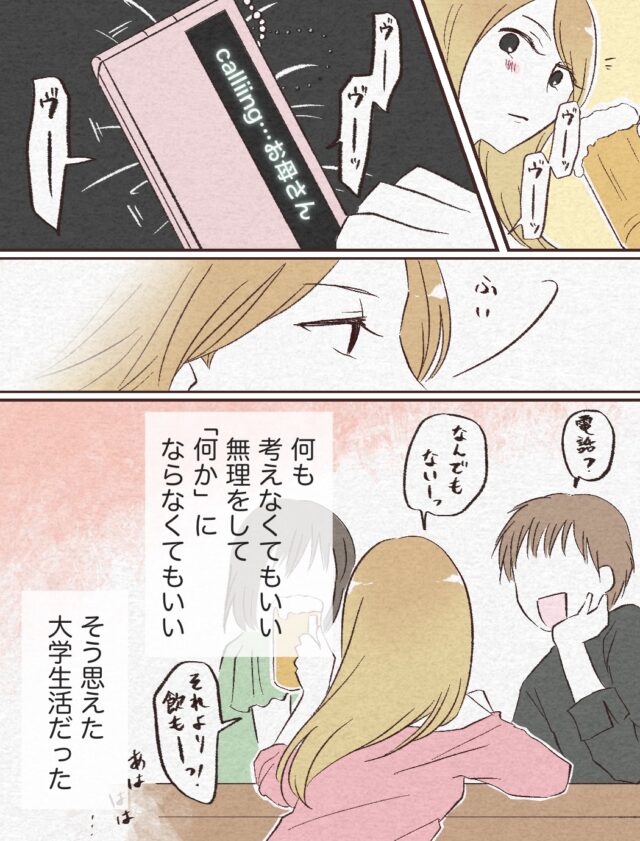 お母さんからの電話に気づきながら電話に出なかったこともあり、何も考えなくていい、無理をして『何か』にならなくてもいい、そんな風に思えた大学生活でした。