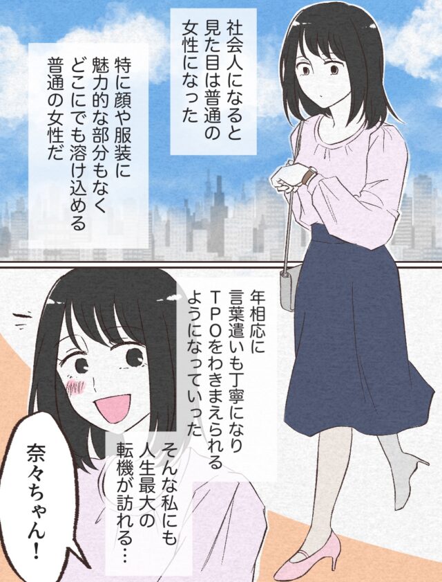 その後、社会人になった奈々さん、見た目はすっかり普通の女性になりました。特に、顔や服装に魅力的な部分もなく、どこにでも溶け込める普通の女性、年相応に言葉遣いも丁寧になり、TPOをわきまえられるようになっていった奈々さんに、人生最大の転機が訪れるのでした。