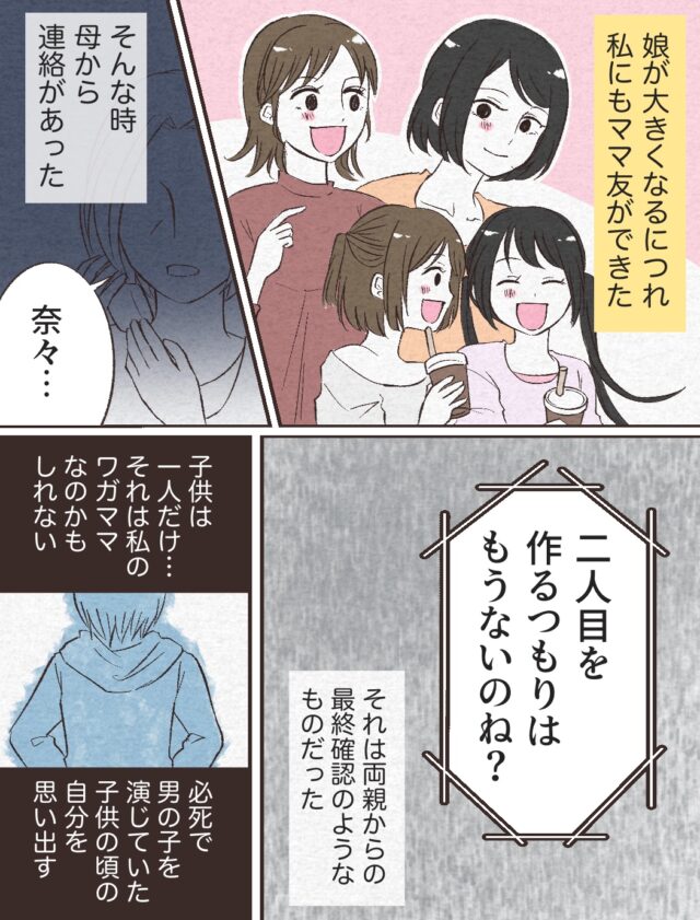 その後、菜乃花ちゃんが大きくなるにつれ、奈々さんにもママ友ができました。そんな時にお母さんから電話があり、「奈々・・二人目を作るつもりはもうないのね?」そう言われた奈々さんは、「両親からの最終確認」のようなものだと思ったのでした。そしてまた「子どもは一人だけ・・それは私のワガママなのかもしれない」と思いながら、必死で男の子を演じていた子どもの頃を思い出しました。