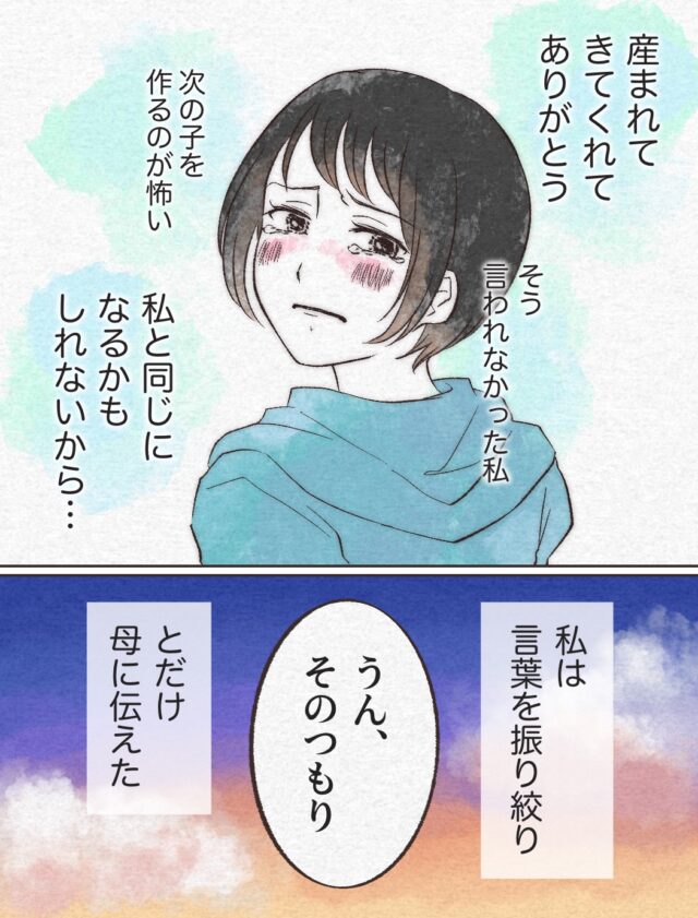 「『産まれてきてくれてありがとう』と言われなかった私、次の子を作るのが怖い・・私と同じになるかもしれないから・・」そう思った奈々さんは、言葉を振り絞り「うん、そもつもり」そうお母さんに伝えたのでした。