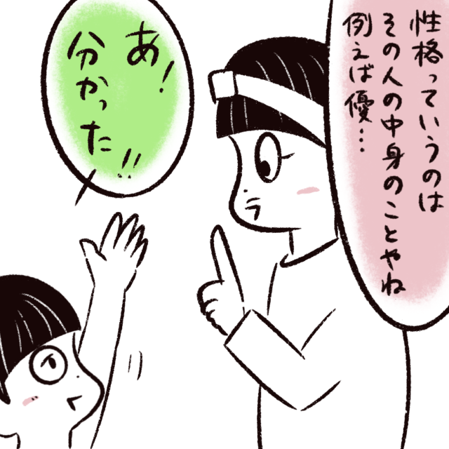 小学2年生の男の子アキくんを育てるまるさんから、性格のお話です。アキくんから「性格って何?」と聞かれたまるさんが質問に答えたところ・・・。
