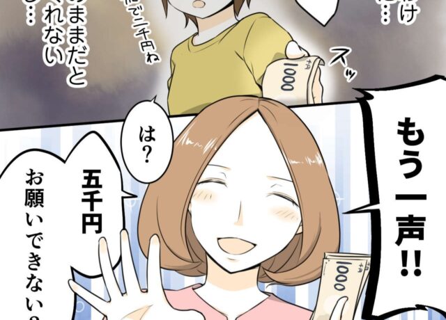 五千円で強烈なママ友と縁が切れるなら安いもの 「一口千円から」と言っておきながら、いざ千円を差し出せば「もう一声、五千円お願いできない?」と図々しい態度を見せるハルちゃんママ。お金持ち度で言ったら事業をしているハルちゃん […]