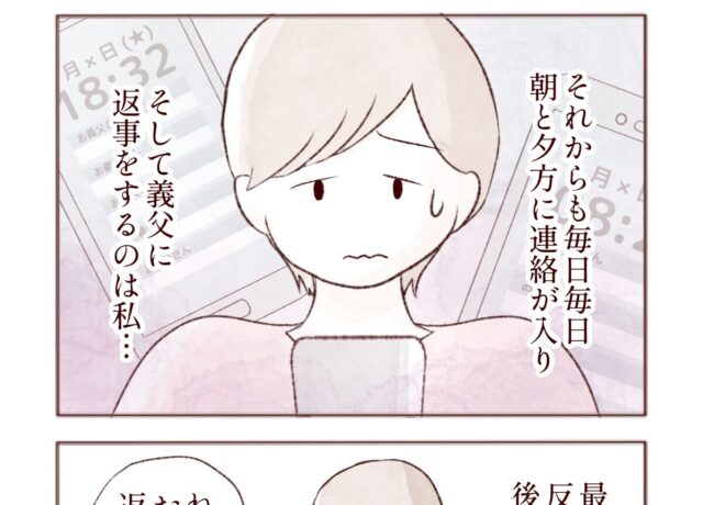 悪気がない義父が憂鬱[3]最初に返信なんてしなければよかった 義父から頻繁にメッセージが来ることをコウイチさんに相談するも、「親孝行だと思って付き合ってあげてよ」と言われてしまったカナコさん。それからも毎日毎日朝と夕方に […]