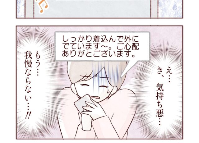 悪気がない義父が憂鬱[6]分刻みに送られるメッセージに恐怖 カナコさんが「もうお義父さんのメッセージに返信しないから!」と言った次の日のこと。9時8分 「カナコさん、いつもの時間にベランダにいなかったけど、大丈夫ですか? […]