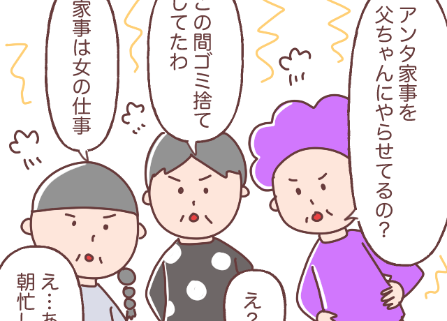 [3]3人のおばぁ|「アンタ家事を父ちゃんにやらせてるの?」夫のゴミ捨てを散々非難されて辟易